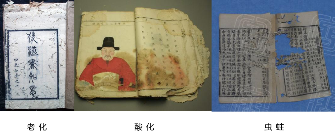 紙質(zhì)文獻(xiàn)的損壞原因有:內(nèi)在原因如原材料、手工造紙/機(jī)械造紙技術(shù)等。外在原因如溫度、濕度、光照、有害氣體、粉塵、霉菌、昆蟲、人為損害等。紙質(zhì)文獻(xiàn)的常見損壞類型有老化、酸化、蟲蛀、霉變、粘連等。文獻(xiàn)修復(fù)師需要根據(jù)文獻(xiàn)損壞情況制定針對性的修復(fù)方案。