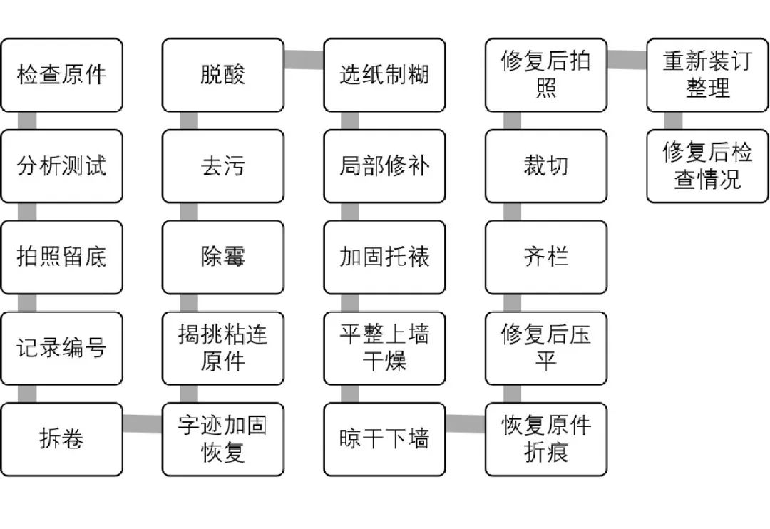紙質(zhì)文獻(xiàn)修復(fù)主要包括以下流程: