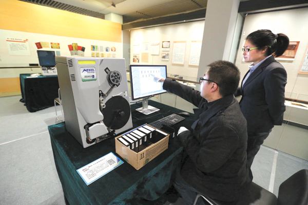 全國圖書館文獻(xiàn)縮微復(fù)制中心工作人員演示漢龍公司縮微設(shè)備