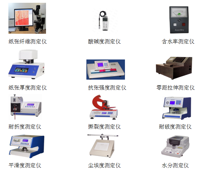 紙張實(shí)驗(yàn)室設(shè)備:紙張厚度測度儀、紙張拉力測試儀、紙張含水率檢測儀、紙張色度儀、紙張耐折度測試儀、紙張撕裂度測試儀、紙張耐破度儀、紙張吸水率測定儀、紙張纖維形態(tài)及力學(xué)性能測試儀、粗糙度儀、耐黃老化試驗(yàn)箱等。