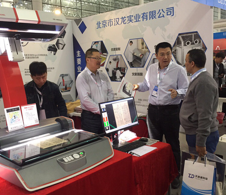 北京市漢龍實(shí)業(yè)有限公司作為業(yè)界領(lǐng)先的文獻(xiàn)保護(hù)整體解決方案提供商,攜賽數(shù)OS14000大幅面高精度仿真復(fù)制掃描儀等設(shè)備參加了此次展會(huì)。在為期四天的展會(huì)中,漢龍公司的參展設(shè)備不斷引來(lái)眾人的圍觀和咨詢(xún)。