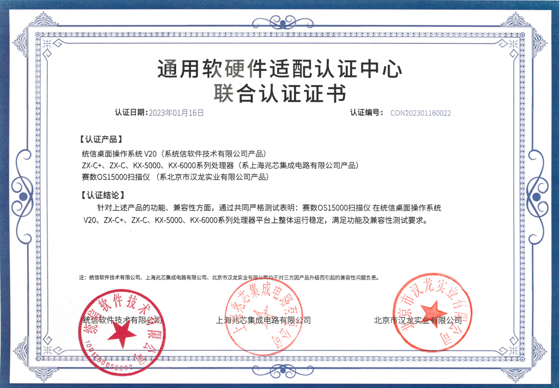 針對北京市漢龍實業(yè)有限公司兩款主營掃描儀——賽數(shù)OS12002掃描儀、賽數(shù)OS15000掃描儀的功能和兼容性方面,統(tǒng)信軟件技術有限公司、上海兆芯集成電路有限公司共同嚴格測試表明:上述產(chǎn)品在中文國產(chǎn)操作系統(tǒng)——統(tǒng)信桌面操作系統(tǒng)V20、ZX-C+、ZX-C、KX-5000、KX-6000系列處理器平臺上整體運行穩(wěn)定,滿足功能及兼容性測試要求。