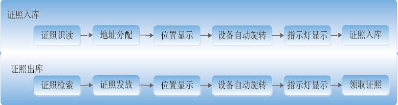 證照存放于存貯庫(kù)中,科學(xué)碼放,規(guī)范保存、準(zhǔn)確定位。采用智能化程序控制,密碼登錄,保證證照出入庫(kù)安全。